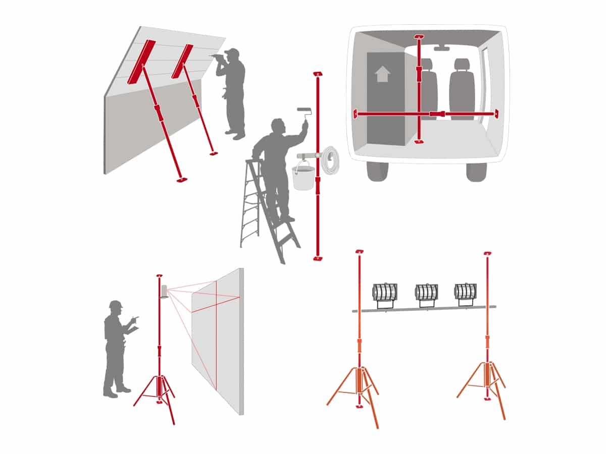 Die stufenlos verstellbare Teleskopstange lässt sich in einem Bereich von 60 bis 375 cm anpassen, was eine präzise Handhabung in unterschiedlichsten Situationen ermöglicht. Mit den neigbaren Anti-Rutsch-Kontaktflächen bleibt die Stütze sicher an Ort und Stelle, was für zusätzliche Stabilität sorgt. Die schnelle Vorspannfederung ermöglicht eine sofortige Fixierung, sodass die Stange in wenigen Sekunden einsatzbereit ist und wertvolle Zeit spart.