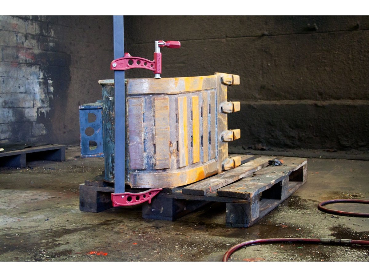 Die ergonomische Konstruktion mit einem umklappbaren Hebel sorgt für eine optimale Kraftübertragung und komfortables Arbeiten, auch bei längeren Einsätzen. Der feste Druckteller verhindert ein Mitdrehen und ermöglicht so eine perfekte Positionierung des Werkstücks. Dank der Kreuzeinkerbung lassen sich auch Rohre und Stangen sicher fixieren.