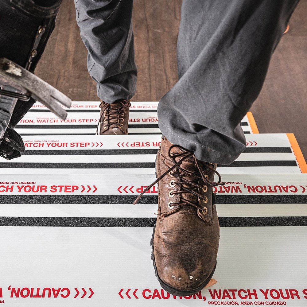 Dank des Haftstreifens auf der Rückseite bleibt der Schutz sicher an Ort und Stelle, auch bei hohem Fußgängerverkehr. Die flexible Anpassung an Auftritte von 26 cm, 28 cm und 29 cm und die universelle Breite von 86 cm machen Stair Shield™ zu einem vielseitigen und praktischen Begleiter für viele Einsatzbereiche.