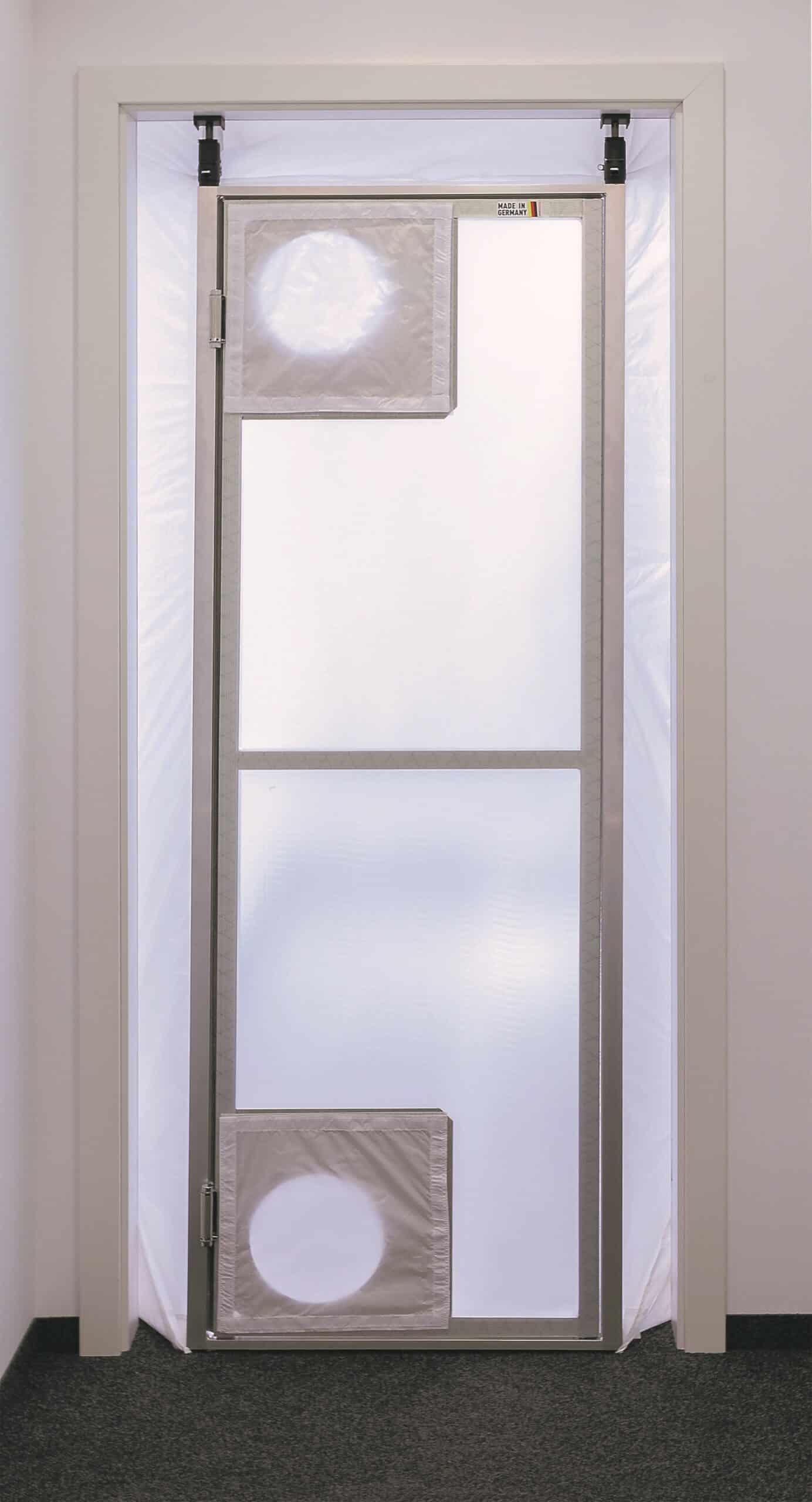 Dank der durchscheinenden Folie bleibt der Gegenverkehr sichtbar, was die Sicherheit und Effizienz auf der Baustelle erhöht. Zwei integrierte Öffnungen für Abzugsschläuche gewährleisten eine effektive Luftzirkulation und Staubabsaugung. Der undurchlässige Stoffkragen sorgt zusätzlich für eine optimale Abdichtung am Türrahmen.